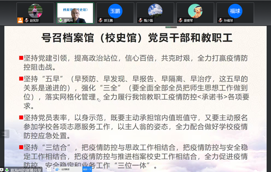 20221130日上午,档案馆(校史馆)党支部组织开展同上一堂疫情防控“大思政课”暨“知信行兰台学习家”第四期专题学习会,旨在教育引导全馆老师深刻认识当前疫情防控形势,支持防疫政策,进一步坚定打赢疫情攻坚战的信心和决心。通过腾讯会议,馆长、支部书记夏海州同志在线授课,全馆人员参加学习。