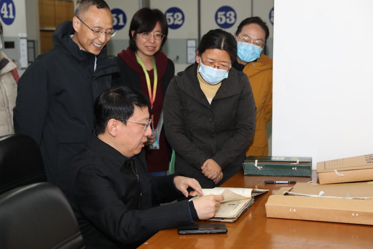 到档案馆调研,姜书记听取了夏海州馆长关于文化走廊设计理念与建设情况;深入档案库房检查指导,细致了解不同门类档案的收集、保管和利用情况,实地查阅了学校发展历程中形成的一些珍贵档案。