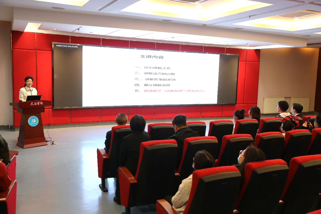 首先,尚老师以与讲解有缘的知名人士故事引入话题,向讲解团成员介绍了讲解工作的流程和意义,通过中国国家博物馆的第一代讲解员齐吉祥老师的案例,启发讲解员要深挖展品背后的故事,经得起观众提问,这样才能讲好工大故事。这让讲解团成员深感使命光荣,责任重大。接着,尚老师重点讲授了讲解技巧,其中包括根据参观人数确定讲解音量,使用富有亲和力、娓娓道来的讲解语言,展现出大方自然的体态姿势等。最后,尚老师对讲解团成员提出了更高层次的要求,一是具备随机应变的能力,二是培养因人施讲的能力,三是丰富自己各方面的知识,做到博学多闻。