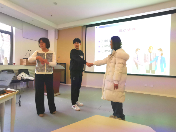 在培训环节,魏爽老师以其深厚的学术底蕴和丰富的实践经验,为讲解员们开启了一场别开生面的礼仪教育之旅。培训伊始,她以周恩来总理的外交礼仪作为切入点,让讲解员们感受到了礼仪在外交场合中的重要作用。随后,她从基础礼仪、服饰礼仪、社交礼仪三方面进行讲解,亲自给同学们示范动作,让讲解员们在实际操作中感受礼仪的魅力。从简单的站姿和坐姿,再到电梯礼仪、坐车礼仪、握手礼仪,魏爽老师的讲解既严谨又生动。讲解员们对“以礼存心,知礼立人”的内涵有了深入了解,并期待运用于今后的讲解工作中。