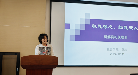 12月11日下午,为进一步提升讲解员专业素养和讲解服务水平,档案馆(校史馆)组织了“校史讲解先锋”特色培训第七讲,邀请社会学院副教授魏爽作题为《“以礼存心,知礼立人”争做优秀讲解员》的礼仪培训。校史志愿讲解员、微特电机科技博物馆志愿讲解员参加培训,张彩会老师主持。夏海州馆长出席并致词。