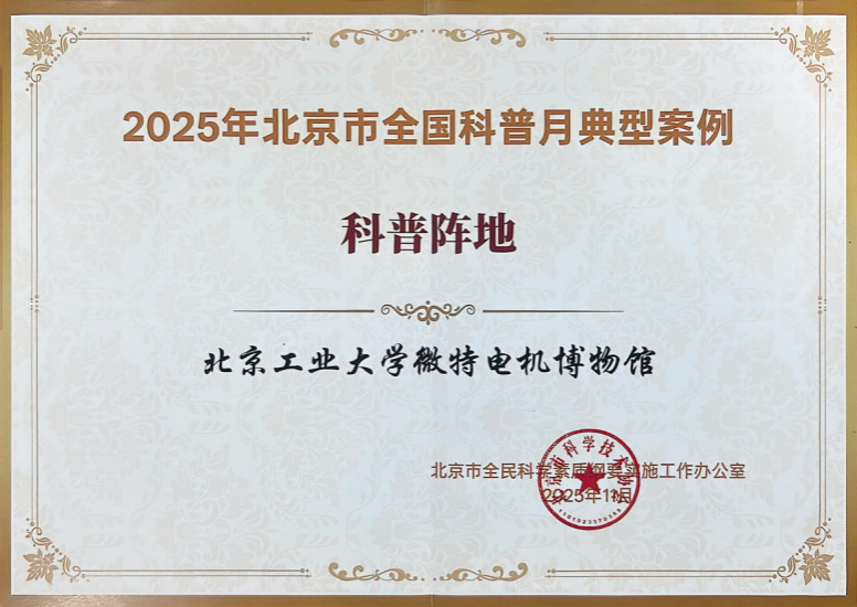 此次获评2025年北京市全国科普月“科普阵地”典型案例,反映了北京市对我校科普工作的认可。在学校党委的领导和我馆领导班子的指导下,微特电机科技博物馆将继续深化校内外合作,充分发挥科普阵地作用,努力提高科普质量和社会影响力,为服务北京科技创新中心建设和我校科普工作做出积极贡献。