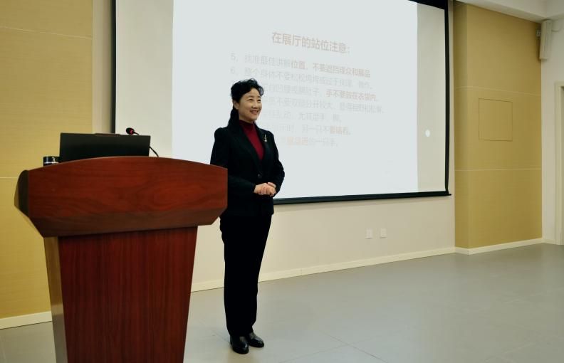 尚老师就讲解礼仪作了现场示范,从仪容仪表、手势规范到站姿走位均一一讲解。她强调,讲解员应保持发型整洁、仪态自然、站姿挺拔、手势规范,引导时五指并拢,鞠躬时“先言后礼”,以展现专业形象及对观众的尊重。